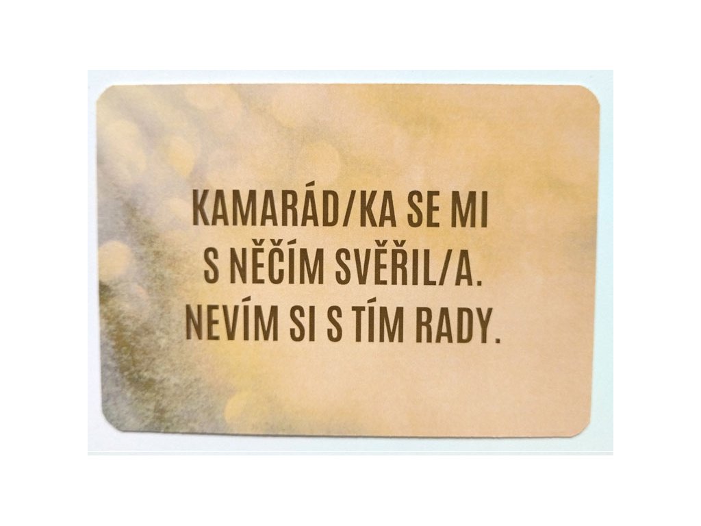Kartičky nenahrazují akutní odbornou pomoc. Pokud jsi v neodkladné tíživé situaci a necítíš se dobře, obrať se na Cestu z krize a jejich nonstop bezplatné linky 116 000 nebo 116 123 nebo na Linku bezpečí 116 111.