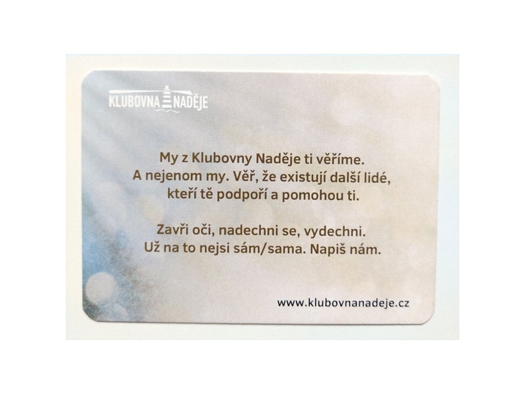 Karty Nadějky jsme vytvořili pro povzbuzení a nasměrování v nelehkých situacích. Každému se může občas přihodit, že se cítí sám, má strach se svěřit nebo neví, jak dál. Nadějky mohou být prvním krokem z temnoty.